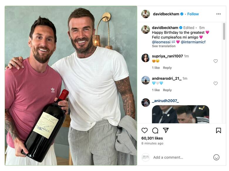 El dirigente del Inter de Miami mostró el particular regalo en un posteo en su cuenta de Instagram, donde se lo ve junto a Messi y a una gran botella de vino. “Feliz cumpleaños al más grande. Feliz cumpleaños amigo”, escribió el inglés.